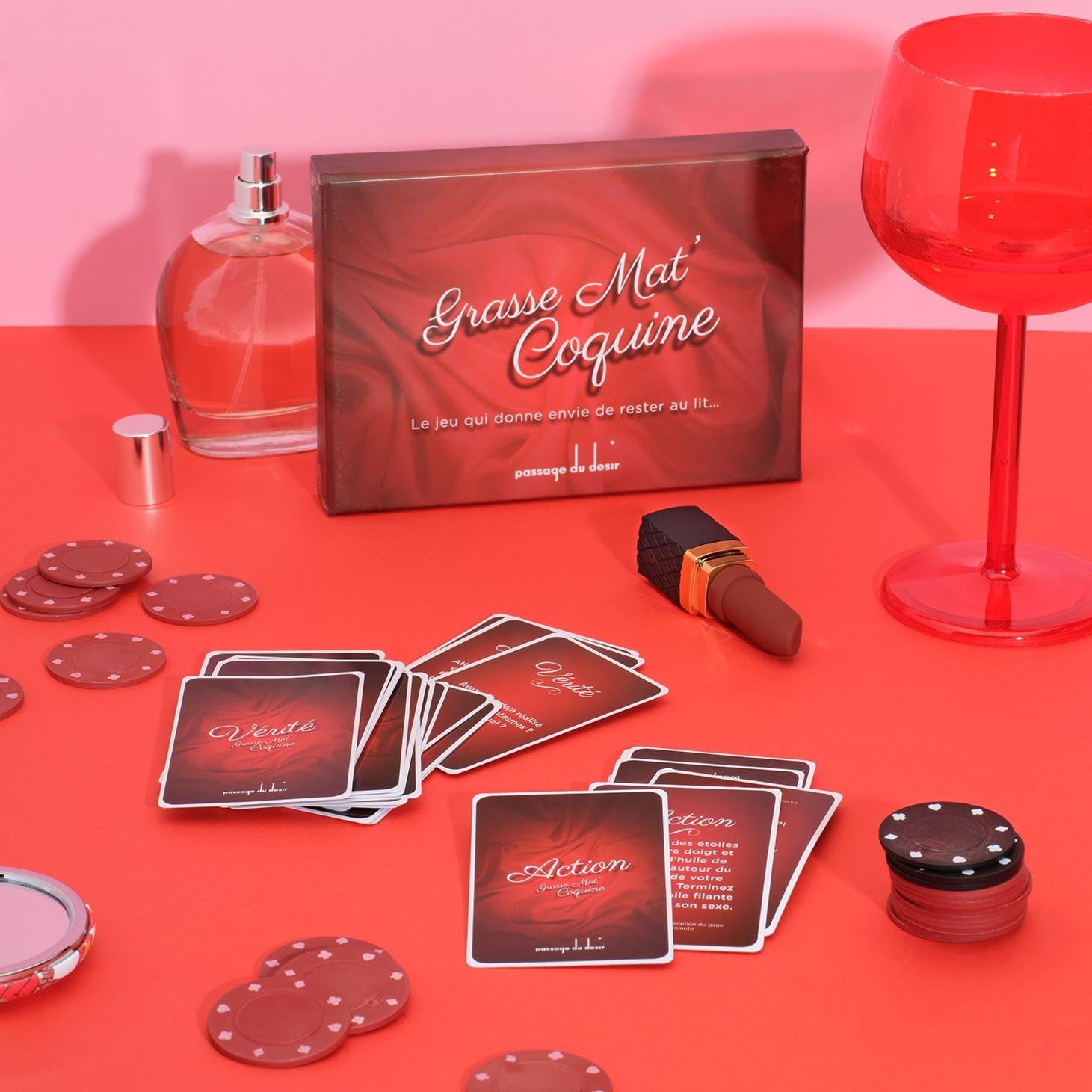 Passage du Désir est fier de vous présenter sa création originale, le jeu Grasse Mat Coquine ! Le principe est simple : on tire une carte Action et une carte Vérité et on a le choix entre répondre à la question ou faire le petit gage coquin.