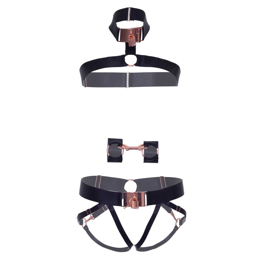 Fabriqué avec un large élastique satiné incroyablement extensible grâce à sa composition en 40% d’élasthanne, cet ensemble vous enveloppe de confort tout en soulignant vos courbes de façon séduisante. Et les détails métalliques ne sont pas en reste ! Les attaches mousqueton, les cadenas et les anneaux scintillent avec élégance dans un magnifique coloris or rose, ajoutant une touche de glamour à votre tenue.