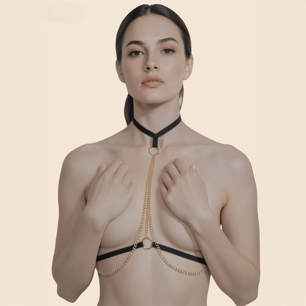 Le harnais de buste à chaînes Anna est une pièce de lingerie aussi audacieuse qu’élégante. Son collier noir met en valeur la nuque et encadre le décolleté, tandis que les chaînes dorées ou argentées descendent le long de la poitrine pour un effet sensuel et raffiné.