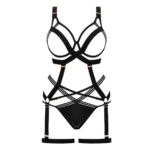 Ses bretelles ajustables assurent un maintien personnalisé, tandis que les bonnets ouverts et la jarretière amovible apportent une touche affirmée et originale. Les détails dorés viennent parfaire l’ensemble avec une note glamour.