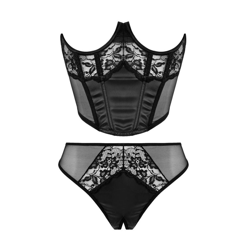 Le bustier met en valeur le buste avec caractère, tandis que la coupe du corset souligne harmonieusement les courbes. Le string ouvert complète l’ensemble avec une touche affirmée, pour un look résolument assumé et séduisant. Tiara est conçu pour celles qui aiment se sentir confiantes, fortes et irrésistibles.