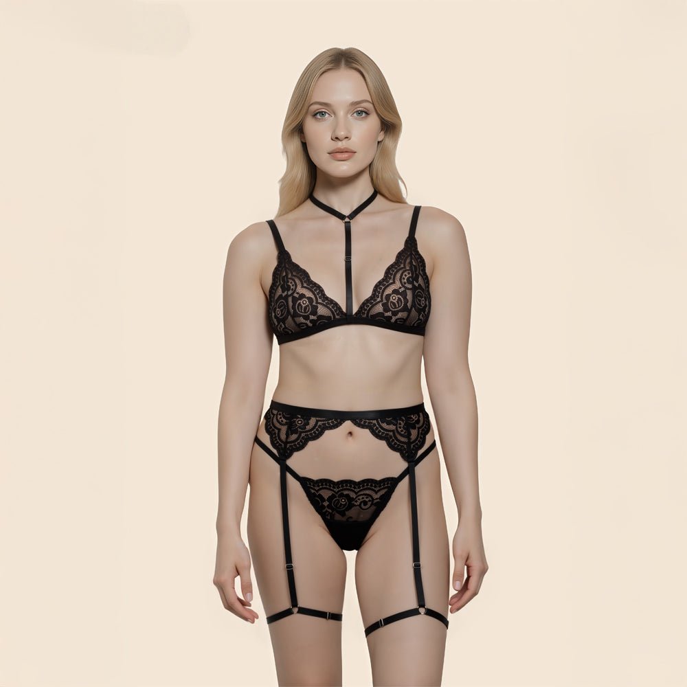 Composé d’un soutien-gorge style harnais en dentelle noire à motif floral, il dispose de ras-de-cou et bretelles réglables pour un ajustement parfait. Le string en dentelle et ses fines lanières apportent une touche délicate et sexy, tandis que les porte-jarretelles réglables en dentelle complètent l’ensemble pour un look harmonieux et séduisant.