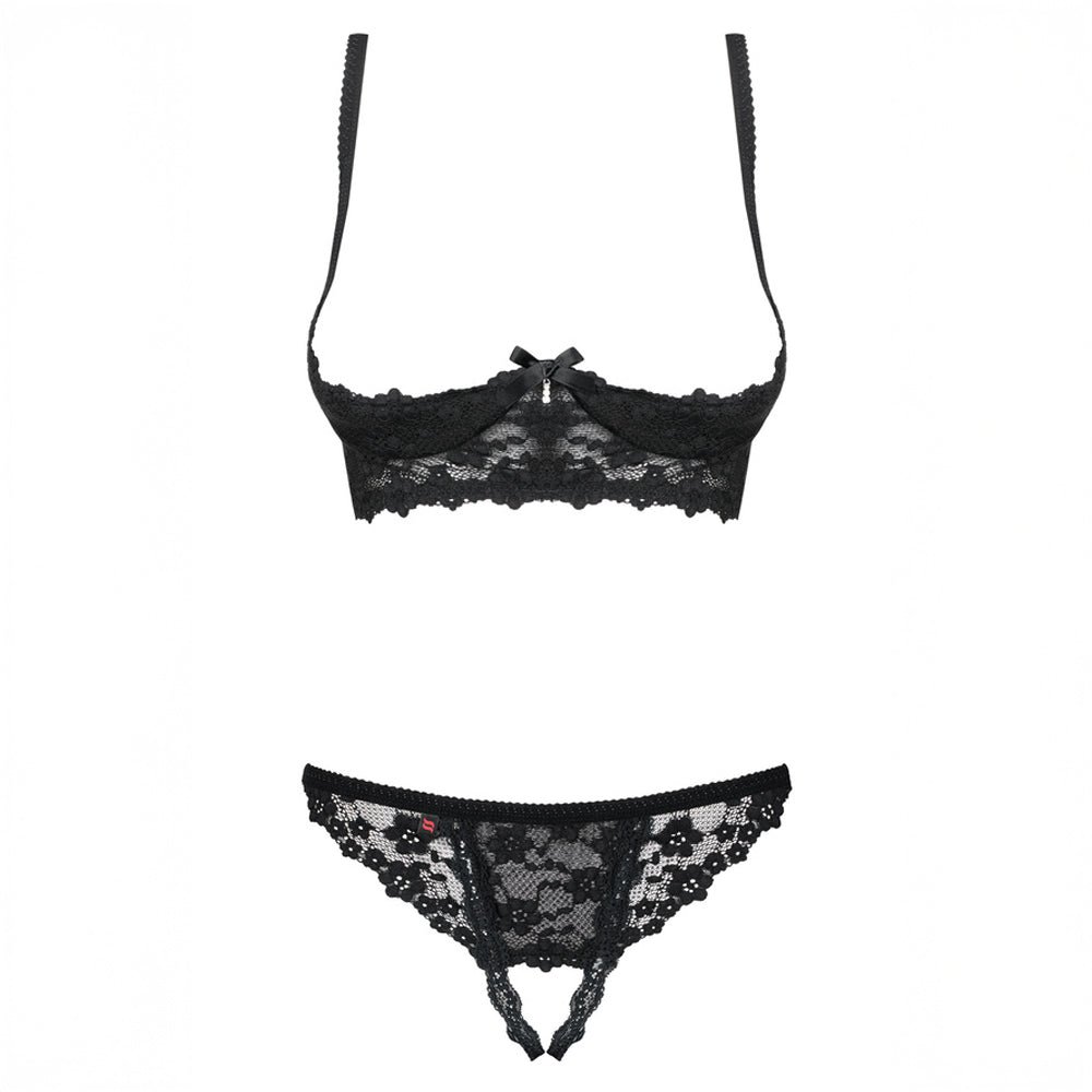 100% libre d’afficher votre poitrine avec un soutien-gorge ouvert… enfin, plutôt 85% puisque votre buste est légèrement soutenu par les armatures et la partie inférieure des bonnets. La dentelle est une frise de fines fleurs. Un petit nœud en satin et un pendentif en gouttes d’eau ajoutent une touche de grâce. Le string en dentelle assorti est tout aussi charmeur et offrant.