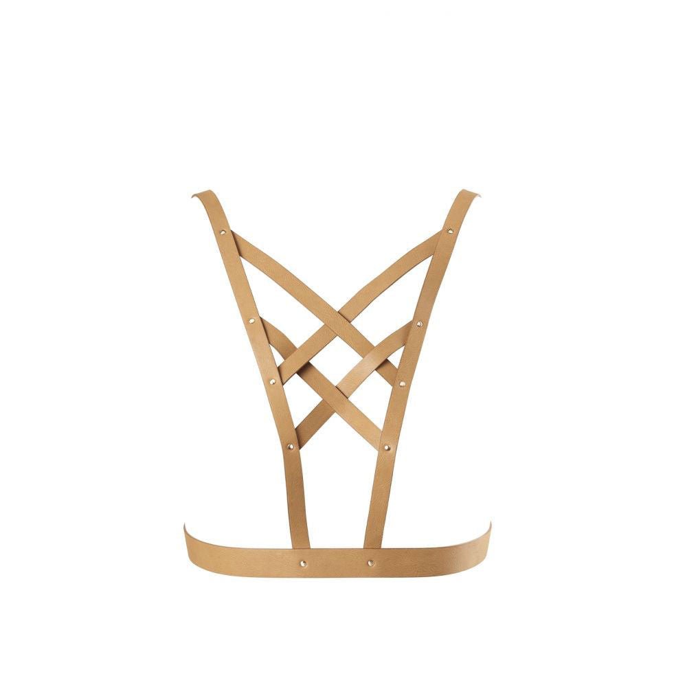 Croisé sur le buste, le harnais est composé de lanières qui s’entrecroisent au centre du buste avec deux liens formant un V. Les seins sont complétement libres afin d’être admirés ou stimulés. Les liens descendent sur une ceinture placée sous la poitrine. Il est aussi équipé de courroies réglables pour s’adapter à la taille.