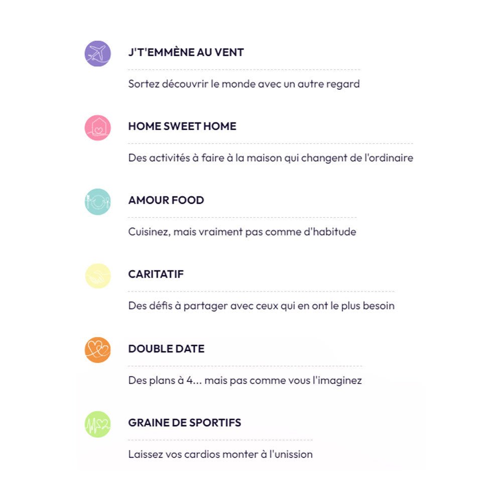 Le principe du jeu est simple : choisissez une des 120 cartes parmi les 6 thématiques proposées au verso, grattez le recto de la carte, et laissez-vous surprendre par le défi ou l’idée de sortie proposée.