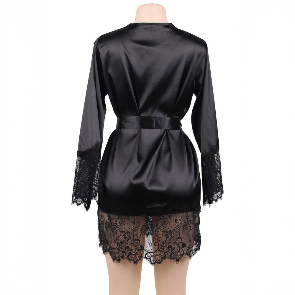 Résisterez-vous au kimono Silk Satin, avec son toucher tout doux et sa coupe haut de gamme ? Ce déshabillé tout en satin est embelli par de larges bandes de dentelles aux motifs floraux aux extrémités de chaque manche et au bas du kimono. Silk Satin est d’un noir brillant, ce qui apporte beaucoup d’élégance à la tenue. Une ceinture et un string sont également fournis avec le kimono, afin de passer des moments plus que chauds…
