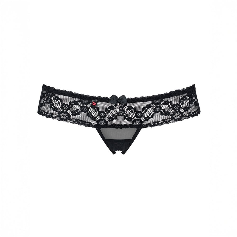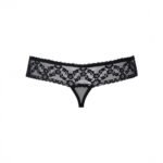 Ce string noir ouvert Obsessive combine dentelle aux jolies fleurs, maille transparente et plis délicats sur le devant pour vous rendre totalement irrésistible.